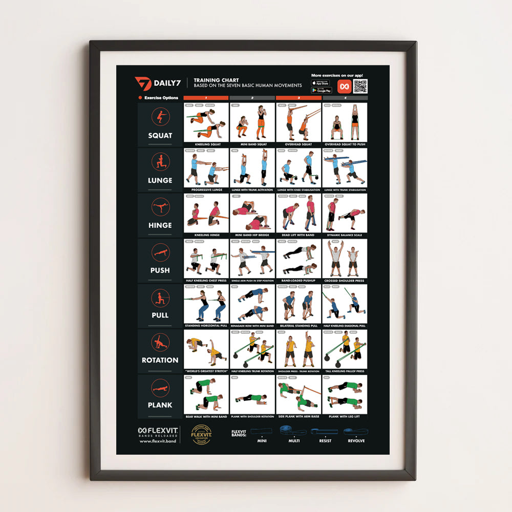 Unlike traditional fitness programs that focus on specific exercises, our DAILY 7 exercise concept aims to integrate all seven basic human movement patterns into the daily exercise routine. No matter where and no matter when – all you need are your FLEXVIT bands!